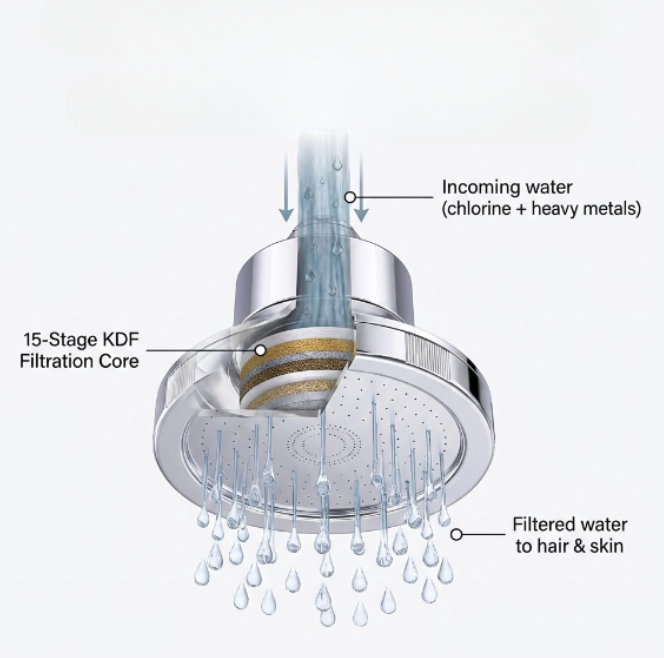 A 15-stage KDF filtration system designed to reduce chlorine and heavy metals before water touches you.